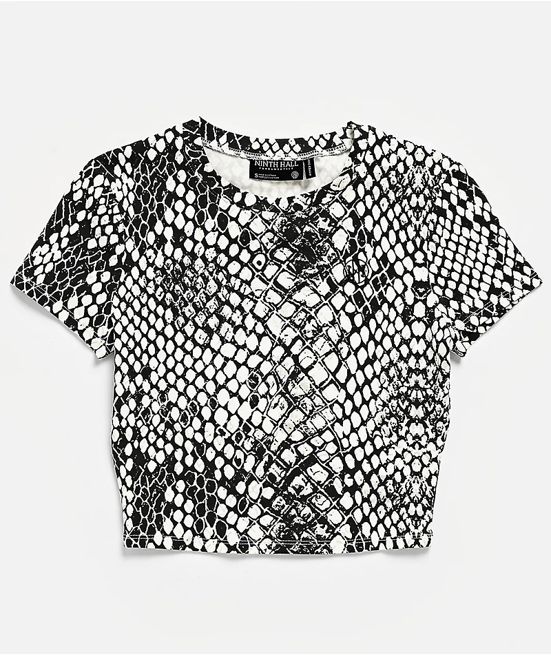 A gothic print stands out on the Carina Snake black and white crop t-shirt from Ninth Hall Fundamentals. The all-over snakeskin pattern creates a high-contrast look, balanced by a small rubber logo on the left chest. A cropped fit with capped sleeves