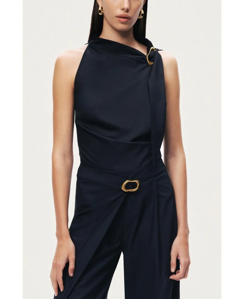 A sleek sleeveless blouse defined by an asymmetric neckline and a sculptural metal buckle detail. Designed to elevate minimal looks with a refined, modern edge.