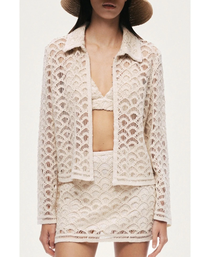 A refined cropped jacket crafted from delicate lace with an intricate textured pattern. Designed with a structured collar and relaxed silhouette, this piece adds effortless elegance to any summer look. Lightweight and breathable, it layers beautifully over matching sets or minimalist essentials for a sophisticated finish.