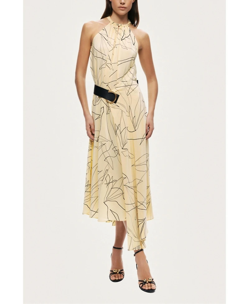 A fluid halter-neck dress with an abstract print, softly defining the waist for an effortless, feminine silhouette.