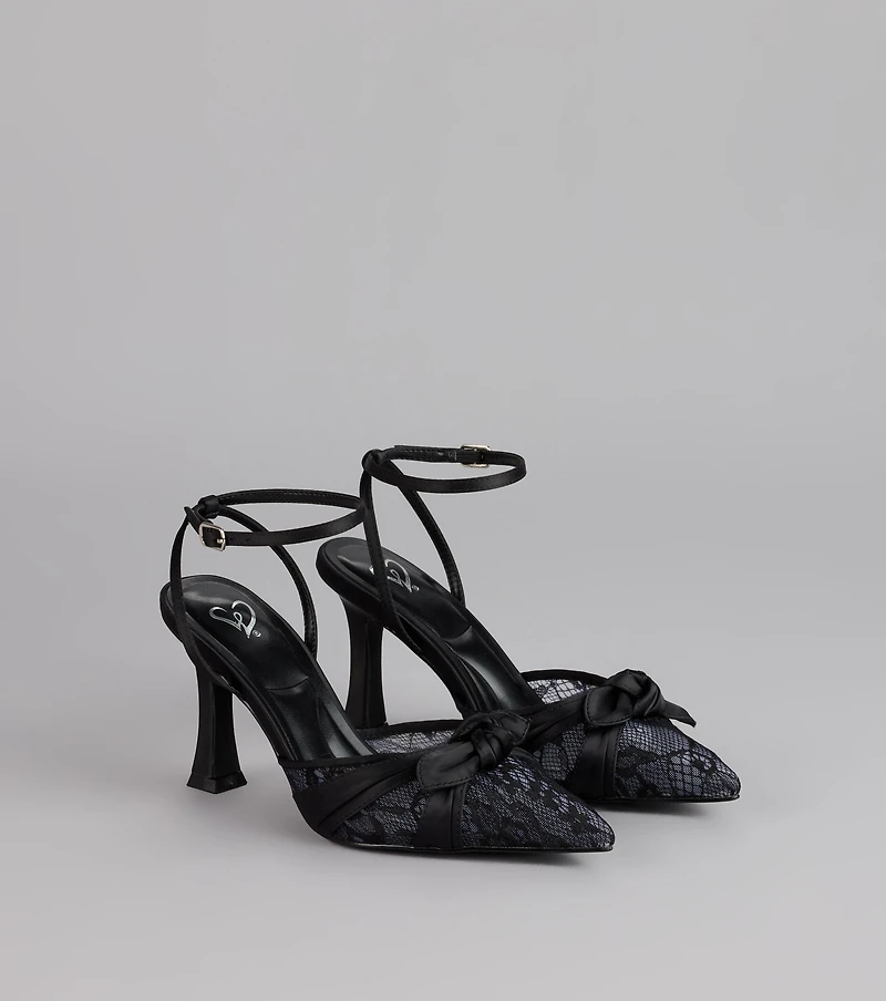 These heels do that soft-meets-bold thing effortlessly. Lace keeps it romantic, the bow adds a subtle statement, and the pointed toe sharpens the whole look. Easy to dress up, impossible to overlook—perfect for nights that start chic and end late.