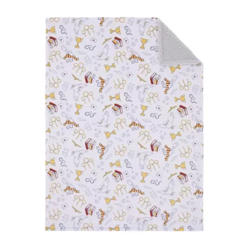 The Harry Potter Sherpa Baby Blanket is detailed with a magical allover pattern in shades of gray, white, red, and gold. This cuddly cute baby blanket features Hogwarts wizarding world icons, Hedwig the Owl, snitch, Gryffindor scarf, trophies, letter "H" for Hogwarts, Harry's glasses, wand, and more; reverses to a plush light gray sherpa back. Measures 30" x 40" and is just the right size for snuggling. Made from super soft cozy fabrics. Machine washable for easy care. Makes a wonderful gift and is perfect for your little wizard in training!