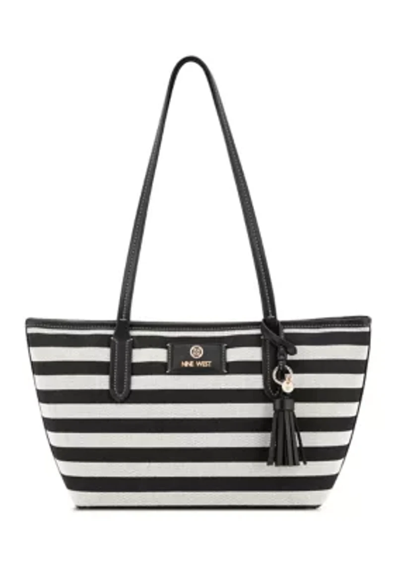 The Nine West designer Nori shopper features internal slip and zipper pockets for organized storage, along with external hardware accents and signature branding. A stylish tassel adornment adds a fashionable finishing touch. Shoulder strap Adornment tassel detail Interior slip and zipper pockets Imported Product Specifications 15" x 4" x 8" Material & Care Faux leather Wipe clean