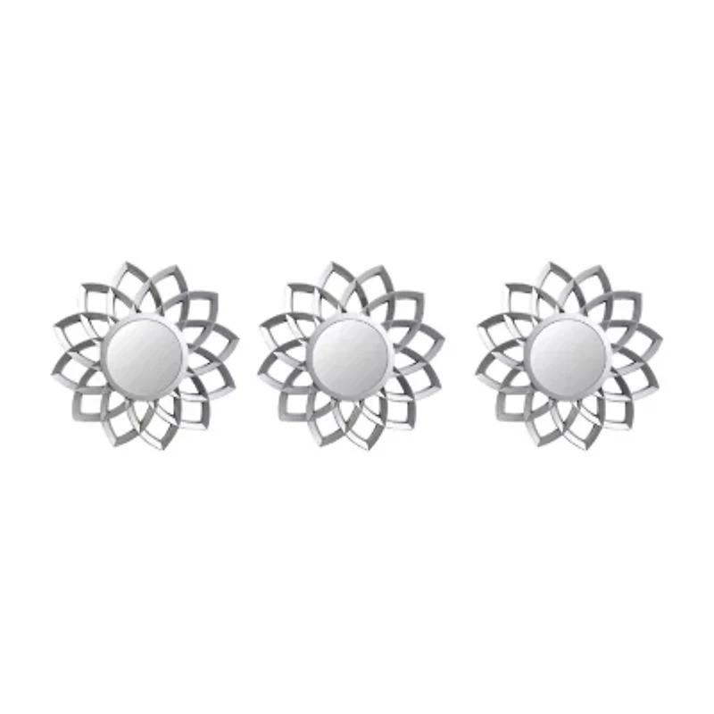 A beautifully crafted mirror is great for opening up the space of any room. This stunning matte silver trio of mini mirrors can be hung in a cluster or scattered throughout the room horizontally or vertically; the options are endless! Easily matched with any decor theme these mirrors include hanging hardware for effortless installment. Product features: set of 3 floral wall mirrors. The mirrors are matte silver in color. Floral inspired frame features a petal-like design. Petal-like border frames a circular mirror. Includes hanging hardware. Recommended for indoor decorative use. Overall dimensions: 10"h x 10"w x .5"d. Center mirror dimensions: 3.5" diameter. Material(s): plastic/ glass