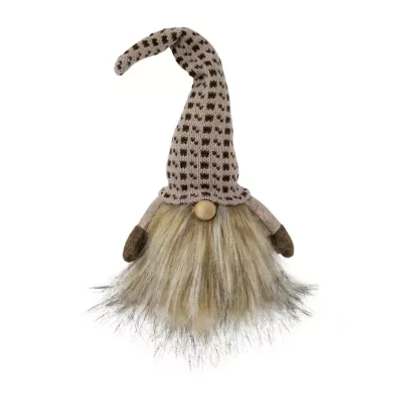 Add a touch of whimsy to your holiday decor with our charming woolly gnome Christmas figure crafted from soft materials This delightful gnome features a knitted pointy hat and felt mittens adding warmth and texture to any room whether placed on a mantel or as a centerpiece on your holiday table This gnome is sure to bring a smile to everyone's face perfect for collectors or as a unique gift This gnome is a must-have for any festive celebration product features: beige and brown hairy sitting gnome the gnome wears a beige and brown patterned hat and mittens its body is covered in hair adding to its whimsical and playful character large and bulbous nose making it a prominent feature on the gnome's face bendable wire in the hat for easy positioning features a weighted bottom ensuring that it stays upright and stable on your table or shelf recommended for indoor use only dimensions: 13"h x 6"w x 4"d material(s): felt/polyester/wood