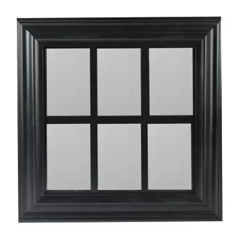A beautifully crafted mirror is great for opening up the space of any room. This window inspired mirror is the perfect addition to your home decor. This mirror can be easily displayed horizontally or vertically. This mirror also includes hanging hardware for effortless installment. Features: square black framed mirror. Inner frame creates 6 small rectangular mirrors. Molded black frame mimics a windowpane. Can be hung vertically or horizontally. Includes hanging hardware. Recommended for indoor use only. Overall dimensions: 17"h x 17"w x .75"d. Overall mirror dimensions: 12.5" high x 12.5" wide. Individual pane dimensions: 6" high x 4" wide. Material(s): glass/plastic