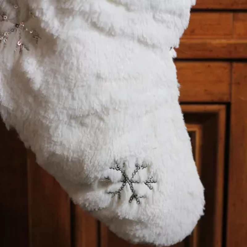 Crafted to bring a touch of elegance to your holiday decor This exquisite stocking features plush white fur that exudes warmth and coziness adorned with sparkling silver sequined snowflakes it captures the enchanting beauty of winter glistening like fresh snow under the moonlight hang it by the fireplace or place it under the tree and let the magic of Christmas fill your home with joy and wonder perfect to hang from mantles stairwells or windows features: white Christmas stocking features silver sequined snowflakes comes ready to hang on a white satin ribbon one-sided design recommended for indoor use only care instructions: spot clean only dimensions: 18"h x 10"w x 50"d material(s): faux-fur/fabric/sequins