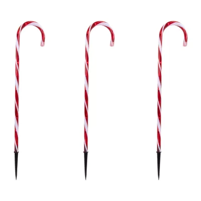 Add a festive touch to your outdoor holiday decor with this set of candy cane pathway markers. These red and white candy cane-shaped pathway markers are designed with LED lights that twinkle and shine creating a cheerful and inviting display. Perfect for lining your walkway or driveway these candy cane pathway markers will brighten up any winter night and bring a touch of magic to your holiday festivities. Product Features: Red and white candy cane pathway markers. Spacing between canes: 20". Lighted string length: 40". Total string length: 68". 5" white tail cord. 23" white lead cord. Additional Product Features: If one bulb burns out the rest will stay lit. UL certified and approved for indoor/outdoor use. Ground stakes included. Contains end-to-end connectors which allows you to connect multiple sets together (not to exceed 210 watts). Comes with replacement bulbs. Dimensions: 26" high by .75" in diameter. Material(s): plastic/wire