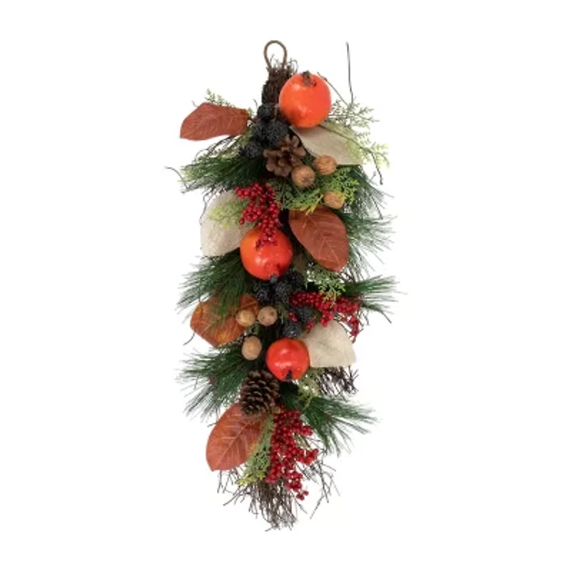 Add this berry and pomegranate teardrop swag to your holiday collection this year! It will be the focal point of your holiday decor while adding pops of color and a touch of nature. Just perfect to hang over mantles and doorways this thanksgiving and Christmas season. Features: berry and pomegranate artificial thanksgiving teardrop swag. Designed on a base of assorted green pine leaves and pine needles. Features blackberries pinecones and several clusters of walnuts. Accented with burlap and metallic red leaves. Designed on long grapevine twig backing. Unlit. Comes ready to hang on a brown loop. Recommended for indoor use. Dimensions: 30"h x 12"w x 6"d. Material(s): grapvine/plastic/foam/burlap/polyester/wood