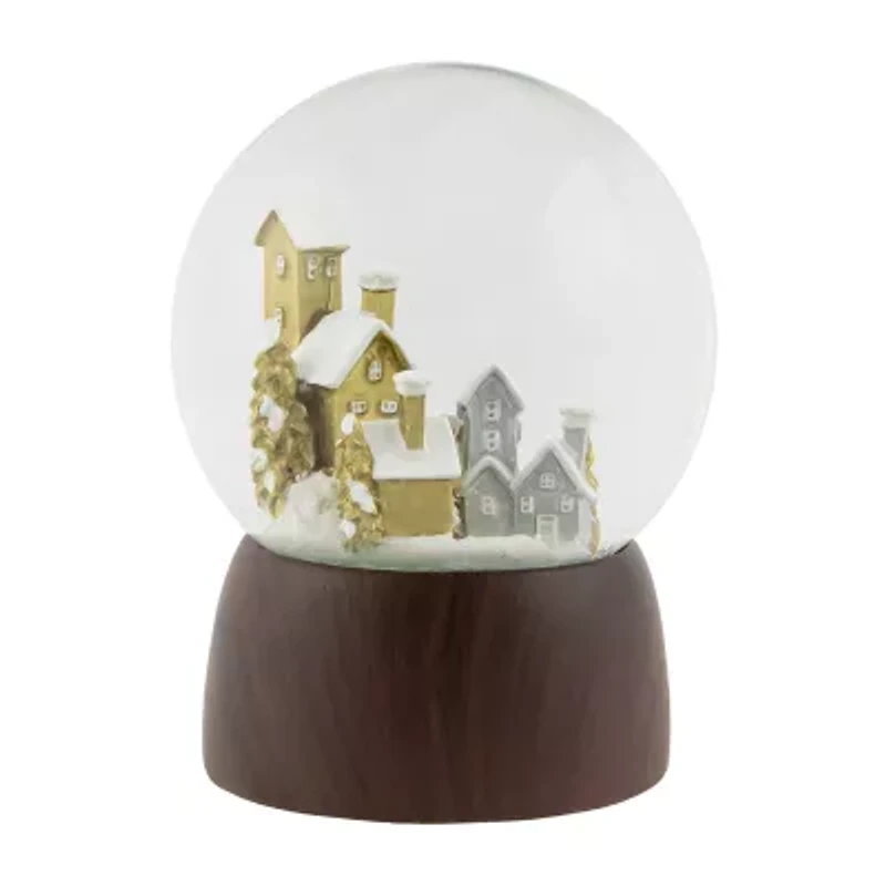 Add a touch of class This Christmas with This stylish village scene musical snow globe featuring a natural wooden style base with houses in a snowy forest playing "we wish you a merry Christmas and a happy new year." perfect for display on a tabletop or a great holiday gift to family and friends product features: holiday village musical snow globe base designed to have a mid-tone wood look wind it up to play "we wish you a merry Christmas" iridescent glitter swirls around once you shake the globe recommended for indoor use only dimensions: 6.5"h x 5"w x 5"d material(s): resin/glass/water