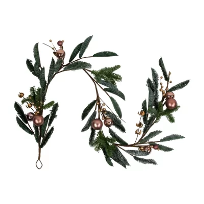 Add an elegant touch to your holiday decor with this stunning Christmas garland. It's decorated with an array of rose gold ball ornaments of different sizes and finishes which are delicately placed on a bed of lush green pine foliage. Perfect for mantles doors or entryways. Product Features: Unlit. Recommended for indoor use - if using outdoors place under a covered area. No assembly required - wreath comes in 1 piece. Includes a heavy duty loop on one end for hanging. Dimensions: 7" high x 72" long. Shatterproof ball sizes: 1" 2" 2.5". Material(s): PE/plastic/metal