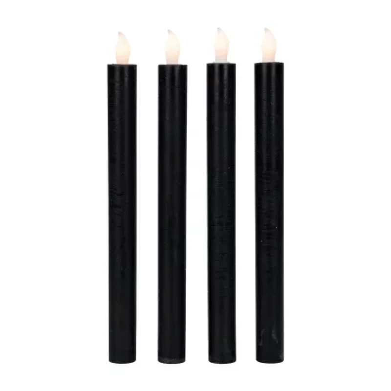 Get ready to add a spine-tingling eerie ambiance to your Halloween decor with this set of solid black taper candles! These candles are the perfect addition to your haunted house or spooky soire creating an atmosphere that sends shivers down your spine. With convenient on/off press buttons you can easily set the mood whenever you please. The smooth finish adds a touch of authenticity while the mesmerizing flickering led lights perfectly emulate the warm mysterious glow of a real candle. Illuminate your Halloween night with safety and style and let these candles cast their enchanting spell on your festivities. Features: set of 4 battery-operated Halloween flameless taper candles. Convenient on/off press system simply press down on the faux flame. Made of real wax with a smooth finish. Each candle is illuminated with a warm white flickering led light. The flicker of the lights emulates the glow of a real candle. Perfect as part of Halloween displays or table centerpieces. Requires 2 'aaa' batteries per candle (not included). Recommended for indoor use only. Dimensions: 9.5" high x .75" diameter. Materials: wax/plastic