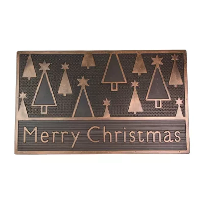 Add this festive christmas doormat to your holiday decor. Featuring christmas trees with a "merry christmas" in bronze against a black background this mat will welcome guests into your home this holiday season. This doormat has been made for long-lasting durability and color. Add this to your front or back doors to your porches or patio area and start creating your christmas memories! product features: rectangular christmas doormat. The mat reads "merry christmas" with a variety of christmas trees. Non-skid durable backing which helps to keep your doormat securely in place. Recommended for outdoor use. Care instructions: sweep or lightly hose clean air dry. Dimensions: 18"h x 30"w x 0.25"d. Material(s): rubber.