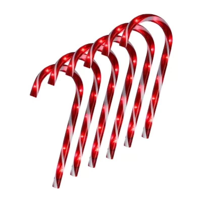 Sweeten up your holiday decor with these candy cane pathway markers. You can create your own wonderland by effortlessly adding lighting in a unique and modern way. Perfect for driveways or any area of your yard that needs a special holiday touch. Product Features: Color: clear bulbs / white wire. Number of bulbs per candy cane: 9. Number of bulbs throughout set: 54. Bulb size: mini. Spacing between each candy cane: 12". Lighted string length: 6'. Total string length: 8'. 24" white lead cord. 9" tail cord. Additional Product Features: Bulbs randomly blink. UL certified and approved for indoor or outdoor use. If one bulb burns out the rest will stay lit. End-to-end connectors allow you to connect multiple sets together (not to exceed 210 watts). 120 volts 60 hertz 0.17 amps 20.4 watts. Wire gauge: 22. Comes with replacement bulbs spare fuses and ground stakes. Dimensions: Candy cane: 12" high x 1" diameter. Stake: 6.25" high. Material(s): plastic/wire/glass bulbs. Note: Set includes 6 of the item pictured
