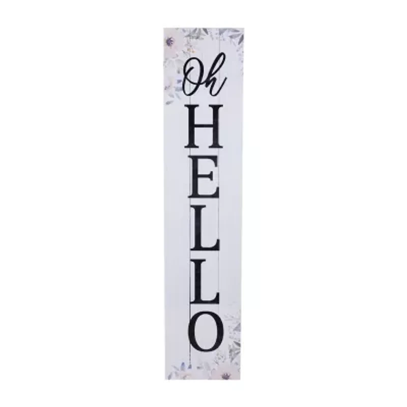 Add a touch of charm to your home with this wooden porch board leaner. Crafted from white wood planks this delightful piece features the welcoming phrase "oh hello" adorned with delicate floral accents. Perfect for any room in your home or can be displayed on your covered porch or patio this stylish wood sign is sure to make a warm and inviting statement. Product features: wooden decorative hello porch board leaner. Crafted with the look of white planks. Sign reads "oh hello". Accented with floral designs. Comes ready to hang with 2 d-ring hangers or can be leaned against a wall. Covered outdoor area or indoor use recommended.