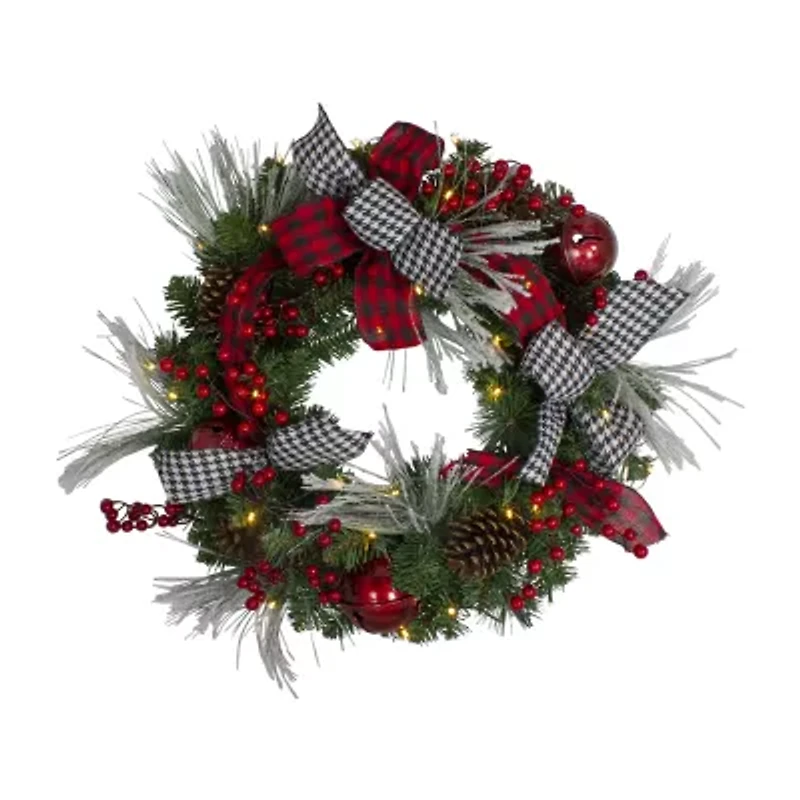 With the hustle and bustle of the Holiday you may not have enough time to fully decorate your home. This lovely pre-decorated wreath will make this year's decorating a breeze. Perfect for hanging on doors over thresholds or adding candles and creating a unique table decoration. Product Features: Pre-lit with 30 warm white mini lights. 2" wide tips. Black and white houndstooth and red and black buffalo plaid ribbon accents. Flocked branch tops large red bells and pinecones add dimensions. Additional Product Features: Light sets on the wreath are UL certified and approved for indoor or outdoor use however the wreath itself is recommended for indoor use. No assembly required - wreath comes in 1 piece. Includes a heavy-duty ring metal frame backing for hanging. Comes with replacement bulbs and spare fuses. Dimensions: 24" diameter (measured from outermost tip/edge to outermost tip/edge across the wreath). Material(s): PVC/plastic/fabric/wood/foam. Note: Branches are compressed for shipment and need to be fluffed out upon arrival to look like the photo.