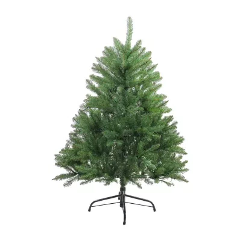 Our northern pine series is one of the best-selling styles in traditional artificial Christmas tree wreath and garland categories the series features perfectly shaped tapered tips in a medium green color and have a natural look and feel the tips are flame-retardant and non-allergenic This 4-foot tall Christmas tree is built with hinged construction for easy setup and comes with a free folding metal tree stand product features: unlit 559 tips 1.75" wide tips medium profile tree flame retardant hinged branch construction for indoor use only 3-piece easy assembly (including stand) comes with a free metal tree stand dimensions: 4' high (from the base of stand to the top of the tree) 36" base diameter (at the widest point) material(s): pvc/metal note: branches are compressed for shipment and need to be fluffed out upon arrival to look like the photo.