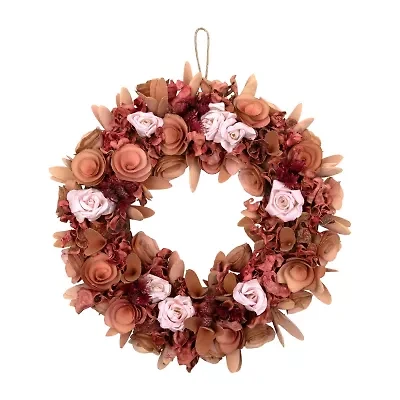 Northlight 12" Pink Silk Roses And Wooden Flowers Artificial Unlit Wreath