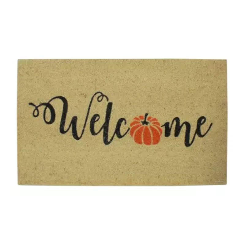 Extend a cheerful greeting to visitors with this eye-catching "Welcome". This rectangular rug is beige coir with a boasting orange pumpkin as the letter "O". Enhance your entry or patio area with a new that fits your Autumn Thanksgiving and Halloween decor! Product Features;. Beige black and orange. Features the word Welcome. Skid-resistant backing. Recommended for outdoor only. Care instructions: rinse with a hose and air dry. Dimensions: 0.75"H x 30"W x 18"D. Material(s): rubber/coir