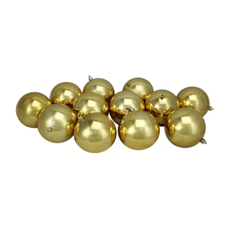 Bring home these shiny orbs to add a distinctive look to your celebrations this year. Timeless and classy these ornaments will add a new level of opulence to your holiday decor. Get these sparklers to hang on your tree or doorways and begin the festivities in style. Product features: 12-piece set. Color: Vegas gold. Finish: shiny. Balls are equipped with gold ornament caps. Pack of matching gold string hangers are included for optional use (ornament hooks not included) dimensions: 4" (100mm) diameter.