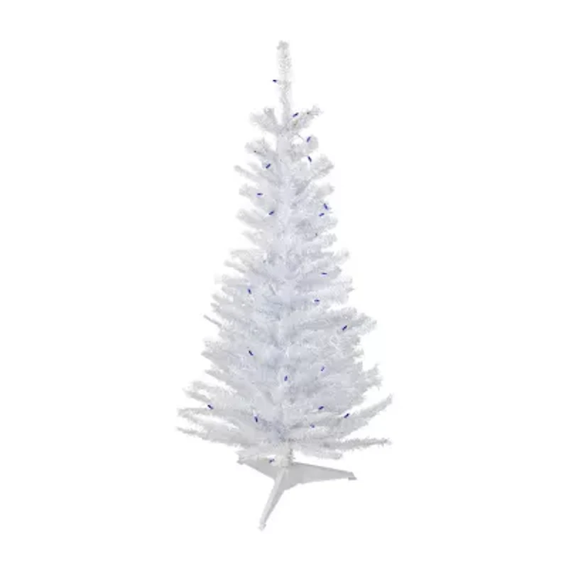 Transform your space into a winter wonderland with the beautiful Woodbury white pine tree it is a designer-inspired alternative to a traditional green tree with its dazzling white pine needles sure to reflect the light from the vibrant blue mini lights that it comes adorned with the lush needles give the tree fullness but the slim profile makes it ideal for small spaces and allows it to fit perfectly in corners product features: pre-lit with 50 blue lights bulb size: mini bulb type: incandescent 187 tips 1.5" wide branch tips 26" white lead cord slim profile tree additional product features: light sets on tree are ul listed for indoor or outdoor use however the tree itself is recommended for indoor use only if one bulb burns out the rest will stay lit lights are equipped with lamp lock feature which makes them replaceable interchangeable and keep them from falling out includes a white plastic tree stand 2-piece easy assembly (including stand) wire gauge: 22 120 volts 60 hertz 17 amps 20.4 watts dimensions: 4' high (from the base of the stand to the top of the tree) 24" base diameter (at the widest point) material(s): pvc/plastic/glass bulbs/wire note: branches are compressed for shipment and need to be fluffed out upon arrival to look like the photo.