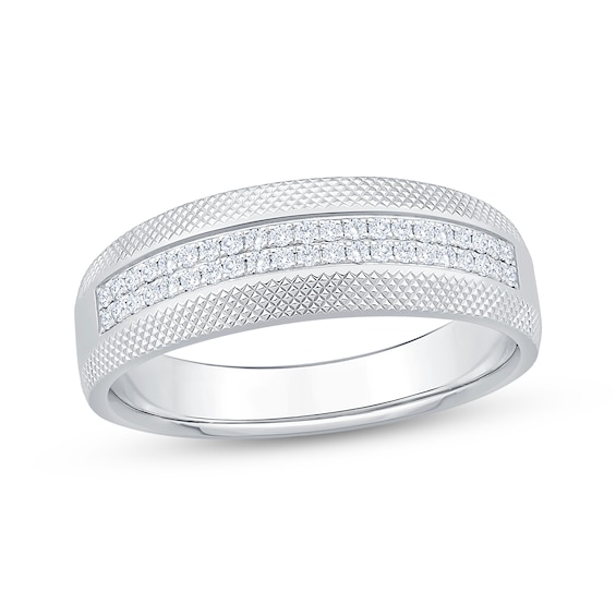 Vow to love him today, tomorrow and always with this exquisite diamond wedding band. 10k white gold nine channel-set round-cut diamonds shine across the satin-finished center polished grooves and stepped edges complete the design total diamond weight is 1/2 carat from the now + forever® collection
