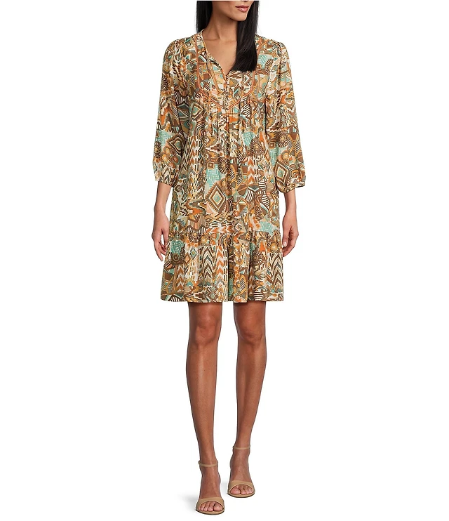 Nurture Petite Size Ikat Print Tassel V-Neck 3/4 Sleeve A-Line Dress