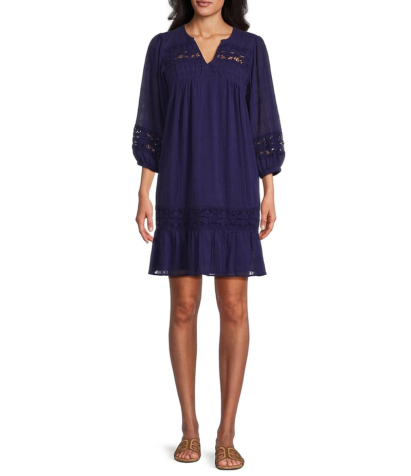Nurture Solid Crinkle Woven Pleated 3/4 Sleeve Notch Neck Short Dress in Franklin, TN