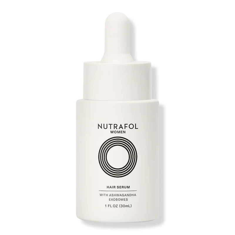 WOMEN'S HAIR SERUM 1.0FLOZ. Benefits: Helps protect against hair thinning caused by breakage directly at the root (1). Targeted support for areas of concern directly at the scalp (1). Supports the scalp microbiome to promote scalp health (1). Visibly thicker, fuller and more voluminous hair (1). Formulated with proprietary Ashwagandha Exosomes, an advanced molecular delivery system that contains RNA, Lipids, and Protein to enhance scalp health. Clinically tested. Certified microbiome-friendly. Color and extension safe. 100% natural fragrance. Formulated without parabens, phthalates, silicones, sulfates. Research Results: In a clinical study in as little as 90 days (1):. Visibly thicker, fuller hair. Visibly reduce breakage. Visibly healthier hair. 1. Nutrafol. Data on file. 2023.. Key Ingredients: Ashwaghanda Exosomes: An advanced molecular delivery system that contains RNA, Lipids, and Protein to enhance scalp health. Irish Moss Peptides: A marine plant cultivated in the Subarctic that helps support visibly thicker, fuller, more voluminous hair. Maca Extract: Adaptogenic botanical that helps protect from oxidative stress to support visibly thicker hair.