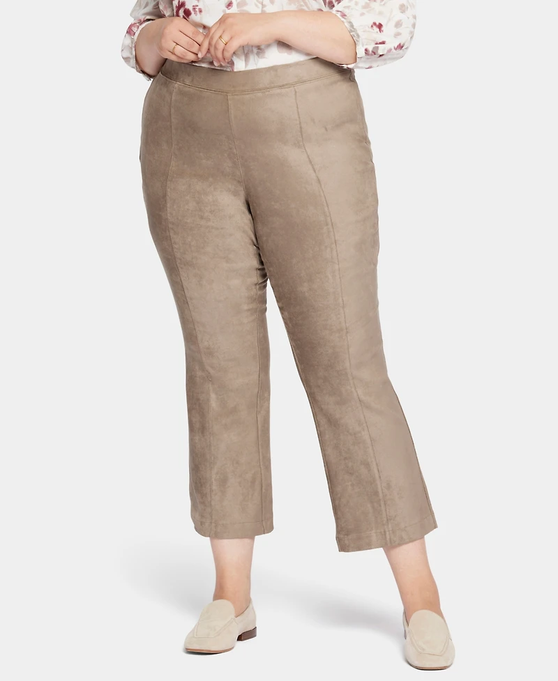 Nydj's slim bootcut pants in plus size in faux suede are super flattering with a sculpting fit, while artfully placed seams give this style an elongating effect. They fall to the perfect ankle length with a subtle kick flare. Features a pull-on waistband that provides maximum comfort.