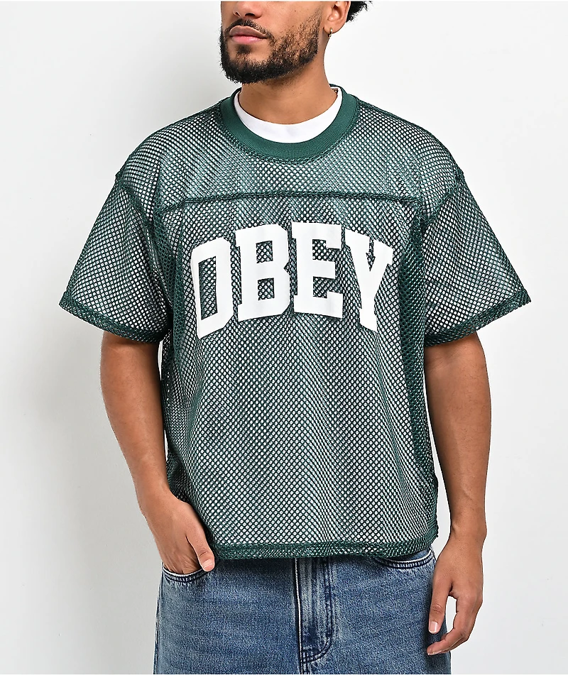 Enjoy a modern, sporty look with the green Collegiate jersey from Obey. Varsity branding script in white across the chest provides an athletic vibe to the mesh top.
