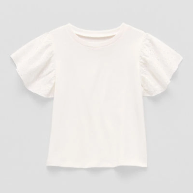 Accented with broderie anglaise designed flutter short sleeves, this pull over t-shirt from Okie Dokie's toddler and little girl's collection is perfect to highlight her everyday look. It's made from a super-soft cotton-blend with recycled fabric and has a classic crew neckline. Pair it with everything from denim shorts to a printed skirt.