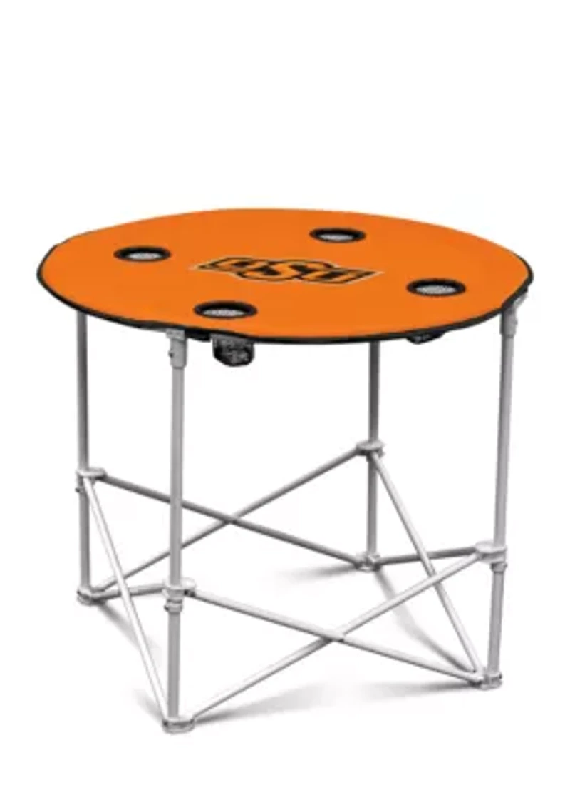 This Oklahoma State Round Table is a necessity for your next tailgate or outdoor event. It features a large Cowboy logo in the center with coordinating trim. With a sturdy surface and four cup holders, it is ideal for a food spread or gathering around with friends. The table top removes from the base and folds in half for storage while being easily transported to-and-fro in the matching zip-up bag with shoulder strap. 28.5" x 28.5" x 24.25" 2-piece set Imported Material & Care Polyester, steel Wipe clean