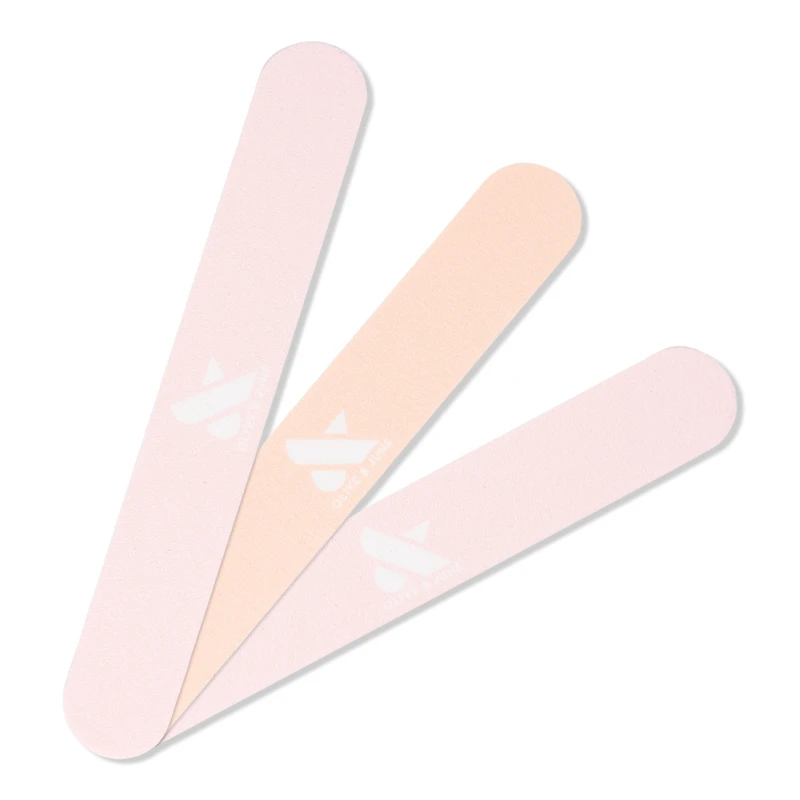 NAIL FILE PACK. Benefits: Salon-quality trio of nail files for perfect results at home. Dual grit nail file helps you achieve your dream shape. Choose the softer grit to shape and perfect nail shape. Tougher grit side ideal for gel or press-on removal. Thinner file perfect for shaping toes in a pedicure. Salon-tested, DIY Approved. Includes: Two salon-style files for your manis. One slim file designed specifically to shape toes and reach smaller, hard-to-reach areas. :