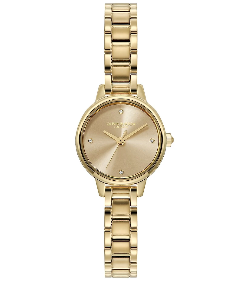 From Olivia Burton, the Women's Mini Quartz Analog Gold Tone Stainless Steel Bracelet Watch features: Thin IP gold stainless steel bracelet and case Light gold sunray dial Link / clasp closure Quartz analog movement Approx. case diameter: 23mm Water resistance: 3B Imported.