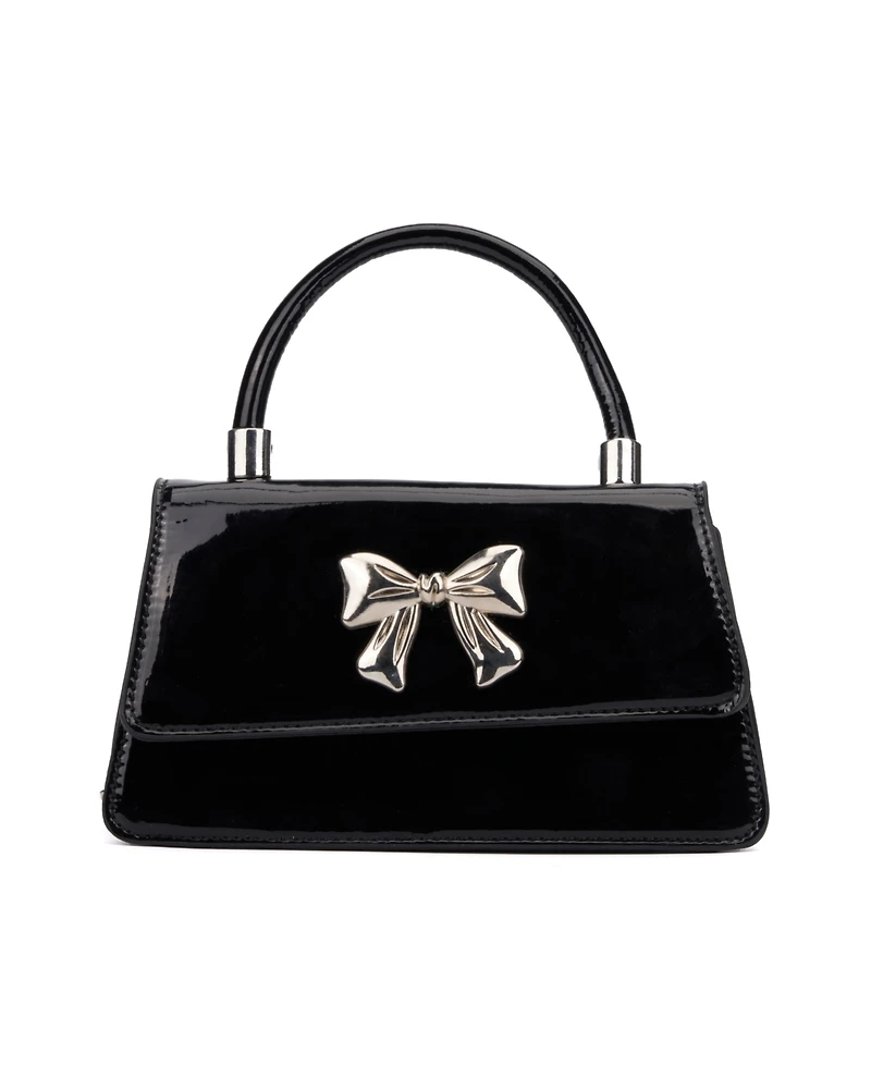 Going out for a night on the town The Anya has you covered. This sleek yet elegant bag is crafted from smooth faux patent leather and features a metallic bow detail at the front, adding a touch of glamour. The top handle and chain crossbody strap offer both style and convenience, making it versatile for any occasion. With the Anya, you can effortlessly elevate your look and keep your essentials close at hand. Make a statement with this chic accessory.