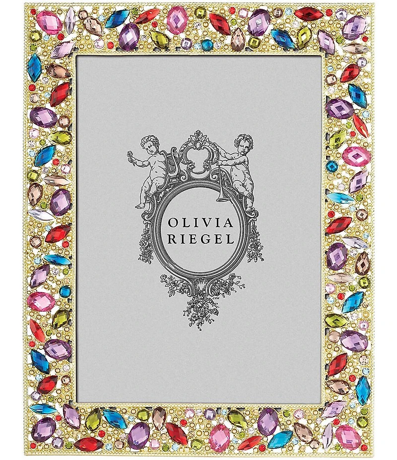 From Olivia Riegel, the Dominique Frame features: Gold finished pewter, encrusted with hundreds of hand-set multi-colored European crystals and glass gems Elegant moiré silk back with easel designed for vertical or horizontal placement Beveled glass Tarnish resistant Signature luxury gift box Wipe clean Dimensions approx. 6.75" x 8.75" Designed to hold a 5" x 7" photo Imported.