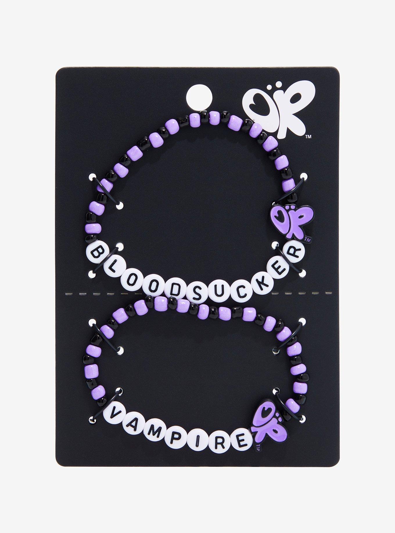 You and your bestie need to sink your teeth into these matching Olivia Rodrigo bracelets! This beaded bracelet set has purple and black beads throughout, an Olivia Rodrigo charm on each, and "Bloodsucker" spelled out on one and "Vampire" on the other. Inspired by her "vampire" song from her Guts album.