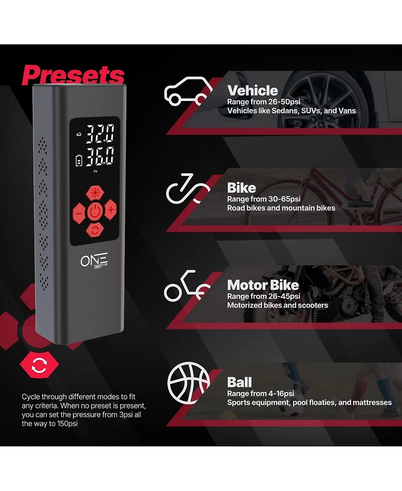 The One Portable Tire Inflator is the ultimate road trip companion. Featuring cutting-edge technology, the One 11.1V Tire Inflator is capable of quickly inflating bike tires, car tires, basketballs, and more. Equipped with a large capacity 32600 Li-ion battery, you can inflate up to 4 car tires, 13 bicycle tires, or even 80 basketballs with a single charge. This tire inflator makes topping off your tires quick and easy. This tire inflator continuously reads the current air pressure and automatically stops once your desired pressure is reached. Enjoy peace of mind and the perfect tire pressure every time. The One tire inflator is designed to be versatile on the road. The built-in Usb and Usb-c power outputs let you charge your mobile devices on the go. Additionally, the 3-mode Led light ensures you have visibility and safety during night-time emergencies or low-light situations. Whether you need to change a tire or charge your phone, the One Tire Inflator has you covered.