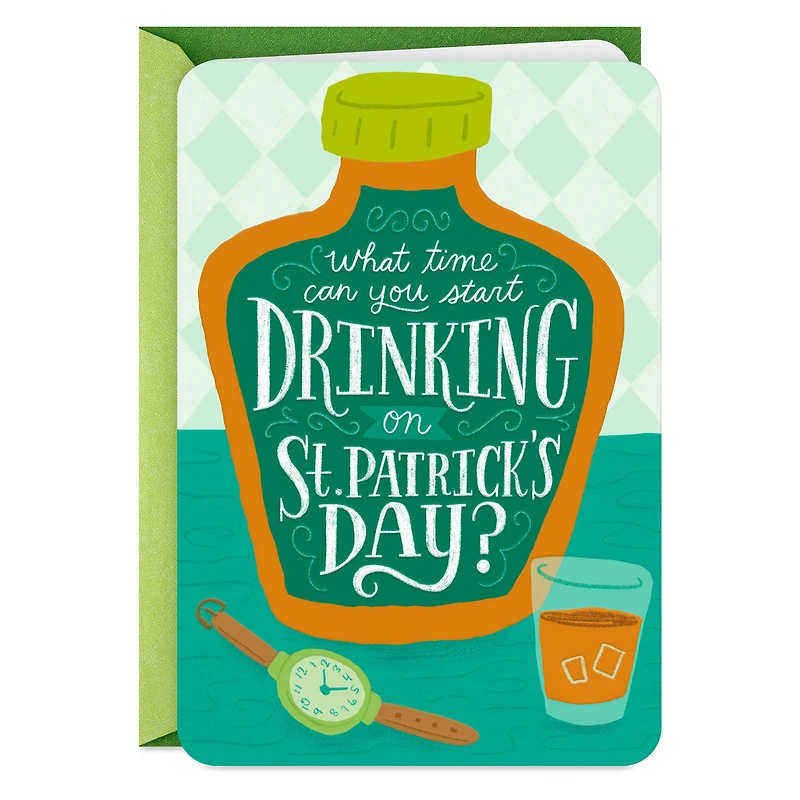 Funny St. Patrick's Day greeting card is illustrated with an embossed bottle of Irish whiskey, rocks glass and wristwatch paired with a joke inside. This humorous card is perfect for friends and family of drinking age.
