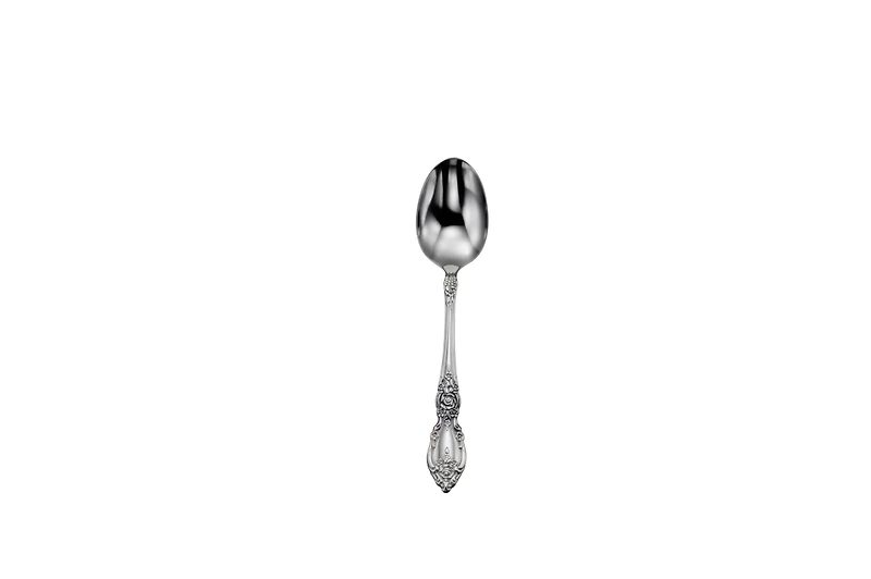 This lovely pattern boasts designs in full bloom that adorn the shapely fiddleback silhouette. Clusters of leaves and flowers start at the neck, while ornate bouquets, delicate beading and open pools of high-mirror reflection make up the handle and tip end. Timeless and romantic, Wordsworth will make a handsome addition to your table.
