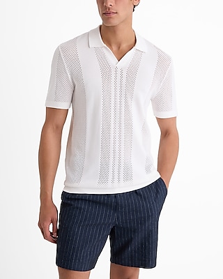 This short sleeve sweater polo features a Johnny collar and a pointelle striped pattern for a breathable and stylish finish.
