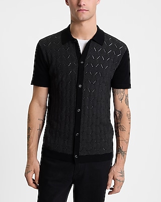 A short sleeve sweater polo that features a point collar, a full button front, and an open stitch geo pattern.