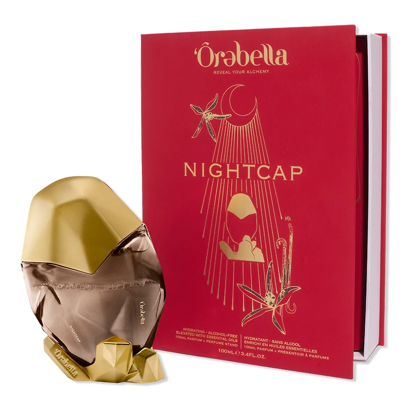 HLDY 2024 GFT ST 1 (NGHTCP 10ML + STND). Features: Hydrating. Alcohol-Free. Dermatologist Tested, Suitable for Sensitive Skin. Bi-phase Formula: Nourishing ORELIXIR Base + Aura-Elevating Scents. Long-lasting, All Day Wear (up to 8 hours). 1% of Net Sales Donated to Charity. Display in geode-inspired PERFUME STAND. Key Notes: Top: Ginger, Cardamom, Guaiacwood. Middle: Vanilla, Cistus. Base: Sandalwood, Patchouli. Plus Aromatherapy Essential Oils: Patchouli Essential Oil, Cistus Essential Oil, Copaiba Essential Oil. Includes: NIGHTCAP Skin Parfum (3.4 oz). PERFUME STAND for 3.4 oz.