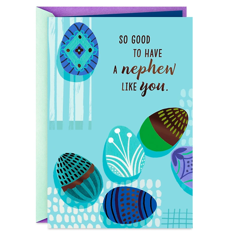 Easter greeting card for nephew features an abstract illustration of decorated eggs in shades of blue, green, brown and white on a light blue background with foil lettering and a loving message.