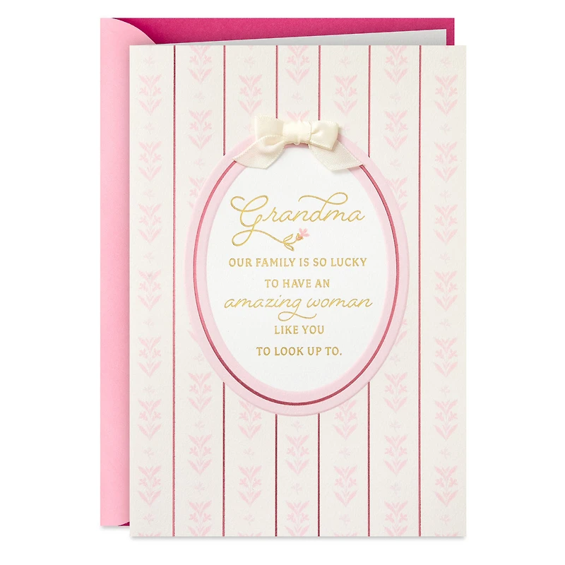 Mother's Day greeting card for grandma features a nostalgic pink and cream floral-striped pattern with a sweet message in a pink-framed oval with shiny gold lettering and miniature satin bow embellishment.