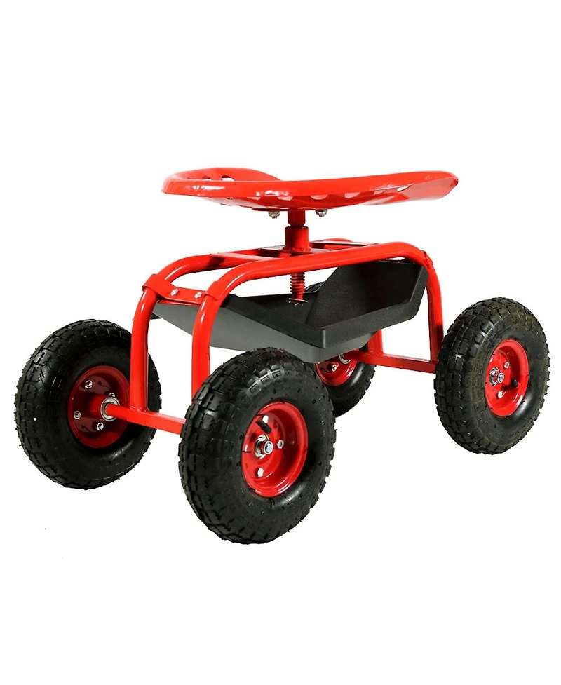 This rolling garden cart features a large, steel seat and an extendable handle that make this garden cart a dream to use while working in the yard. Aside from the convenience, this cart is engineered to last with a heavy-duty, powder-coated steel frame, steel axles, an extendable steel handle, a matching steel wire basket, pneumatic tires with coated rims, and a black plastic tray for holding tools and other convenient items. The seat features a 360-degree swivel motion to face any direction needed to complete the job. Moving this cart is easy too, just pull the cart with the extendable steering handle. Use this handy swivel cart while working in the yard to alleviate back strain or to take a well-deserved seat whenever needed.