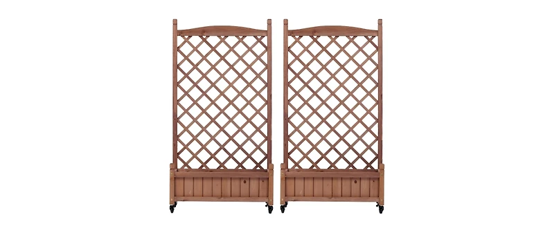 Outdoor Patio Wood Raised Garden Bed Planter Box with Trellis, Wheels, Brown, Set of 2