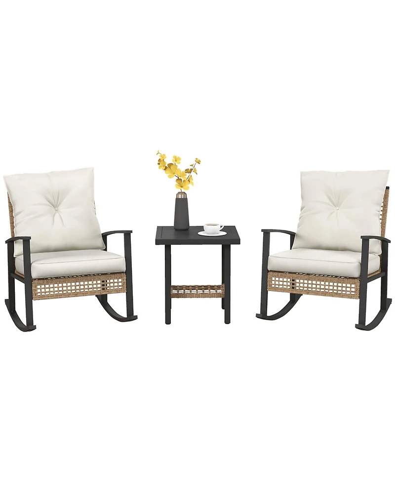 Share a snack, rock, relax and have a chat. Outsunny has a 3-piece patio furniture set that includes 2 outdoor rocking chairs and a coffee table. Made from weather-ready metal that's galvanized and powder-coated, the chairs offer a smooth sway on a fully cushioned surface.