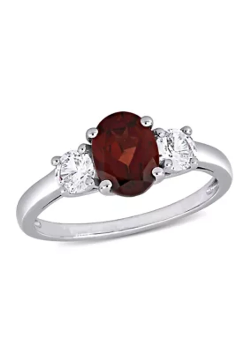 Oval Cut Garnet and Created White Sapphire 3-Stone Ring Sterling Silver